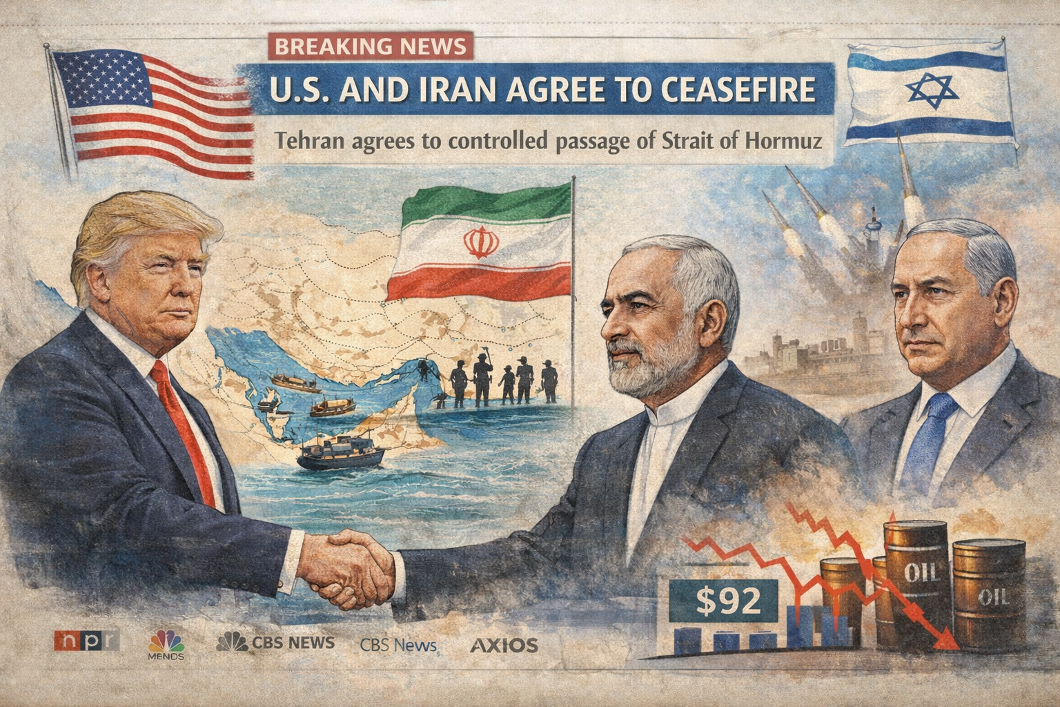 Les États-Unis et l’Iran sont parvenus à un accord de cessez-le-feu mardi, moins de deux heures avant l’échéance fixée par Trump. Celui-ci a annoncé que les États-Unis et Israël suspendraient les bombardements contre l’Iran pendant deux semaines, à condition que l’Iran accepte de rouvrir le détroit d’Ormuz à une circulation sécurisée durant cette période.