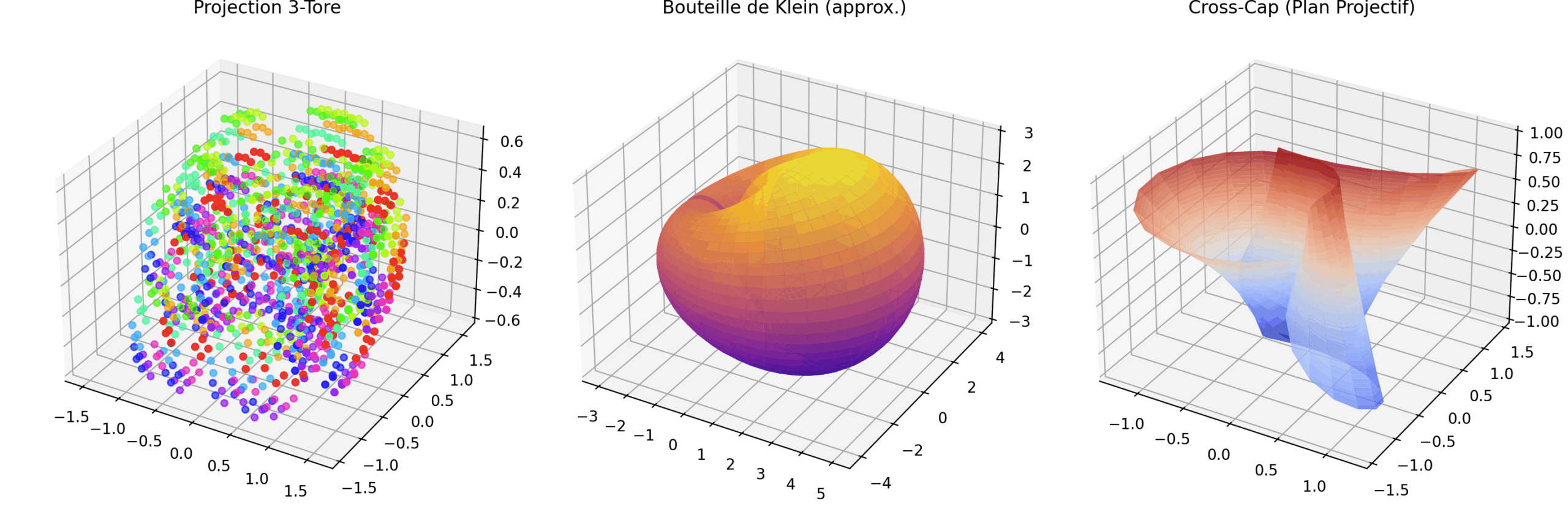- Exploration des dimensions supérieures : 3-tore, bouteille de Klein, plan projectif