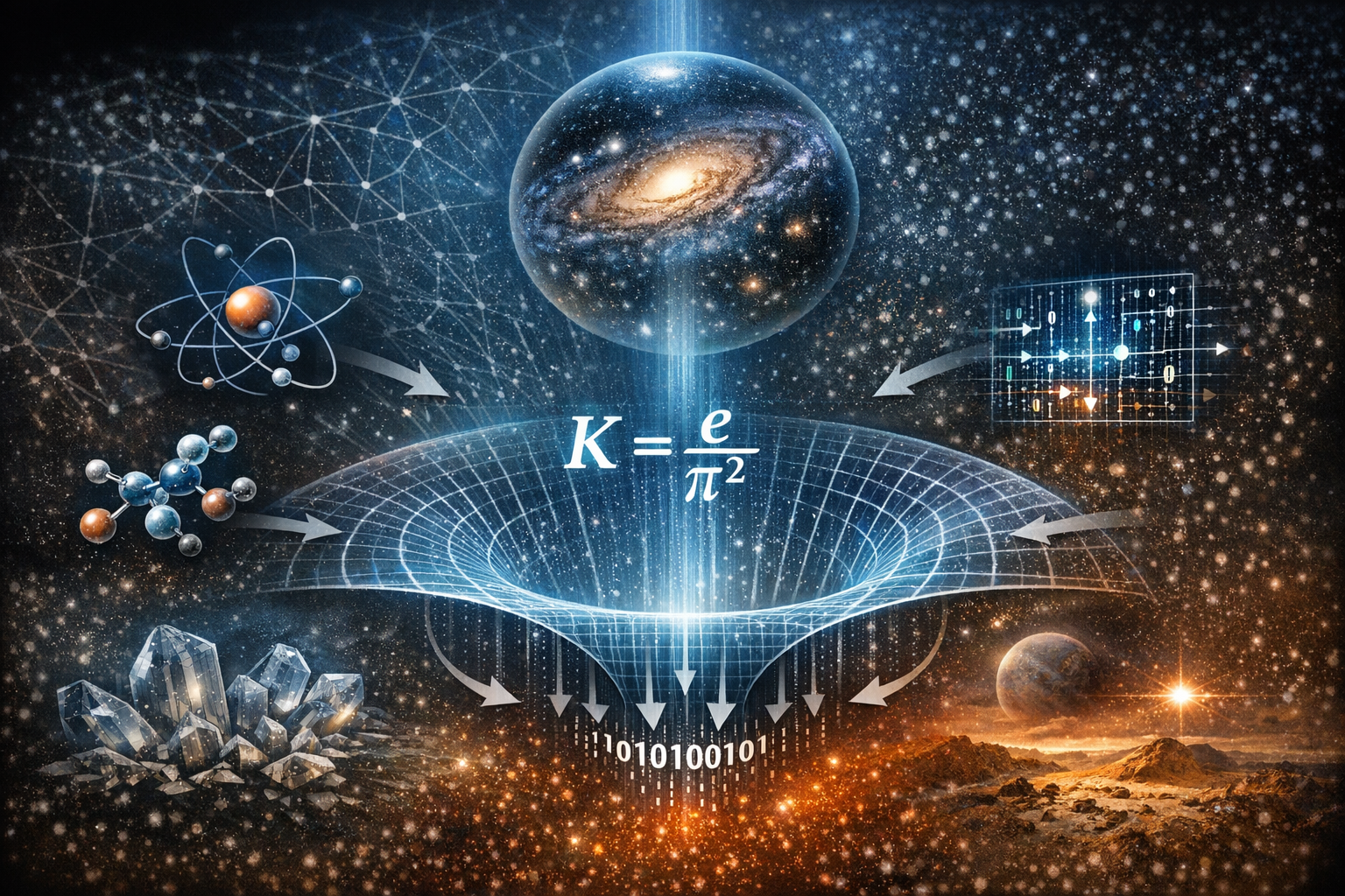 La forme même de n’est pas arbitraire. Le nombre est historiquement lié à la croissance combinatoire, à l’entropie et aux processus de maximisation sous contrainte ; apparaît dans les problèmes de confinement, de géométrie et de modes. Leur rapport exprime une tension canonique entre expansion entropique et contrainte géométrique.