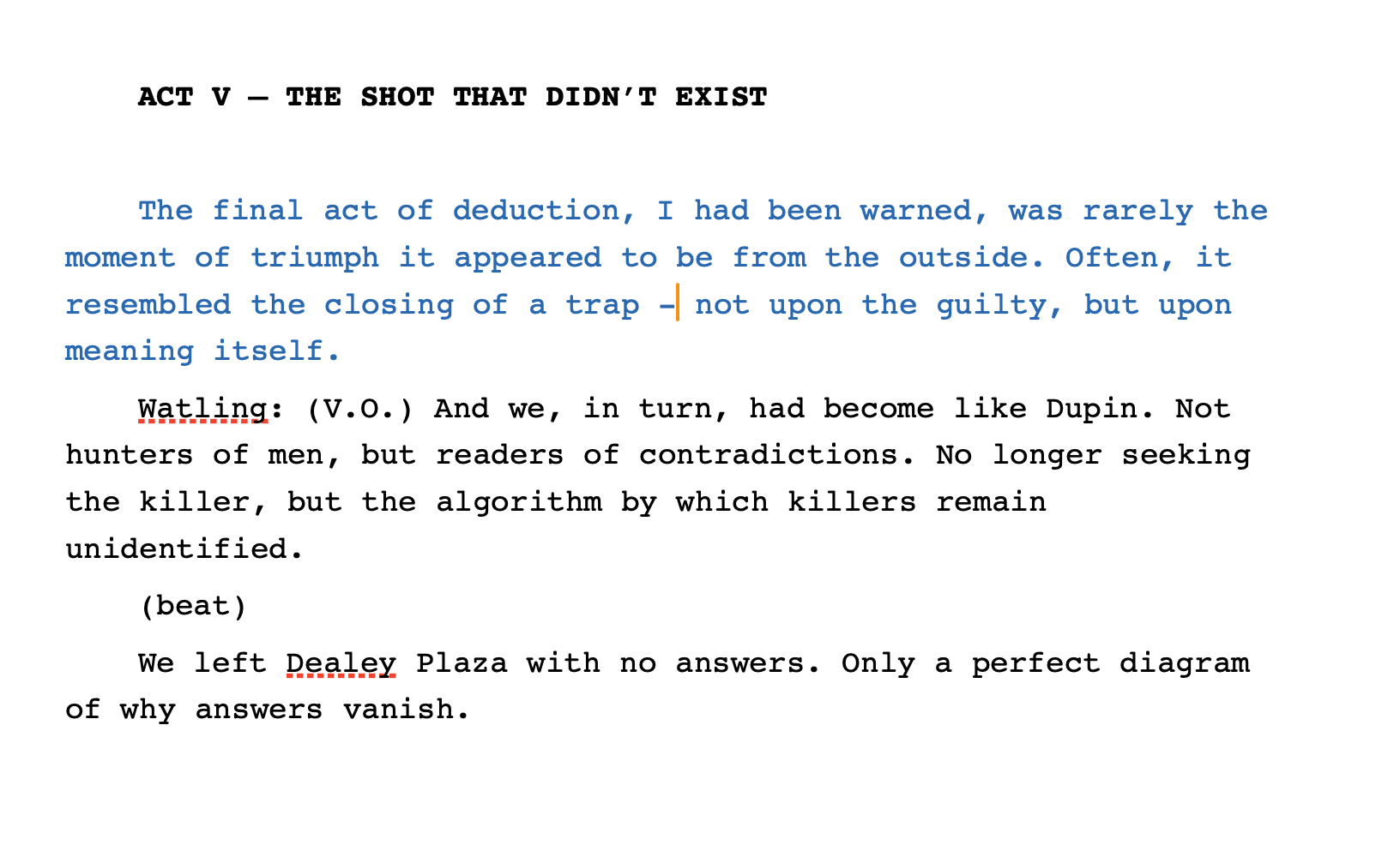 « Il n’y a pas de tueur dans cette histoire, » dit finalement Holmesion. « Il n’y a qu’une structure qui garantit que le tueur ne puisse jamais être découvert. Au moment où l’on en nomme un, le système se réarrange pour l’expulser comme un allergène, comme un corps étranger. »