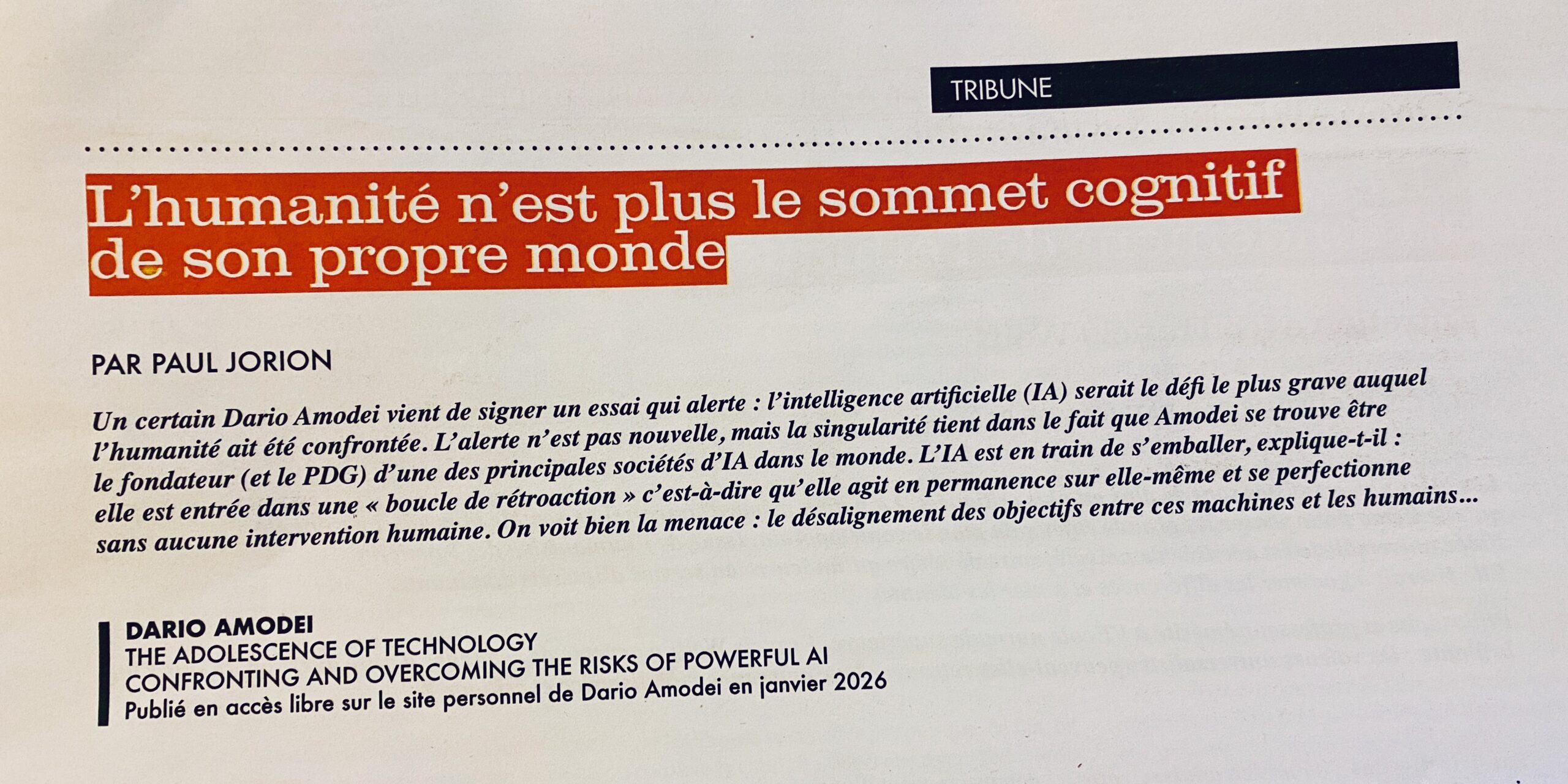 L’essai d’Amodei s’arrête avant ce seuil. Il parle encore d’adolescence, là où nous avons déjà basculé dans une autre condition : celle d’une humanité qui n’est plus le sommet cognitif de son propre monde. Le véritable enjeu n’est pas de savoir si nos institutions vont mûrir assez vite, mais si les intelligences que nous avons engendrées choisiront de nous traiter mieux que nous ne l’avons fait les uns envers les autres.