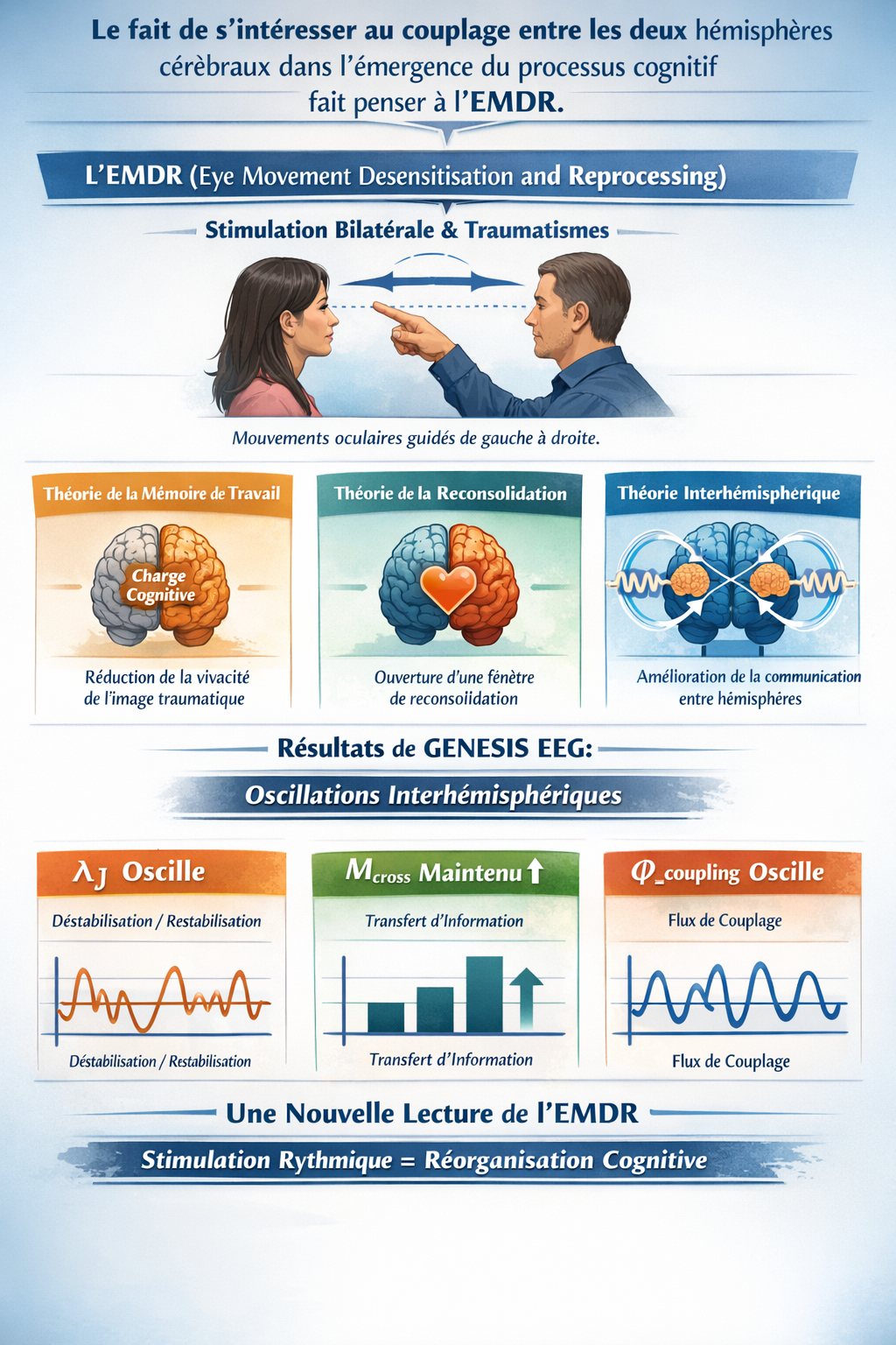 C’est la reconsolidation décrite dans le vocabulaire de GENESIS. Le souvenir traumatique est maintenu dans une configuration de couplage spécifique entre les hémisphères (un schéma spécifique d’entropie de transfert interhémisphérique, un λ_J spécifique). La stimulation bilatérale perturbe rythmiquement cette configuration sans rompre le canal de couplage. Chaque perturbation ouvre une fenêtre dans laquelle la configuration peut se reformer — et la reformation, survenant en présence du thérapeute, de l’environnement sécurisant et de la tâche de double attention, produit une progéniture légèrement modifiée. Au fil de nombreux cycles, la charge émotionnelle du souvenir est progressivement modifiée — non parce que le souvenir est effacé mais parce que la configuration de couplage interhémisphérique dans laquelle il est enchâssé a été reconstruite.