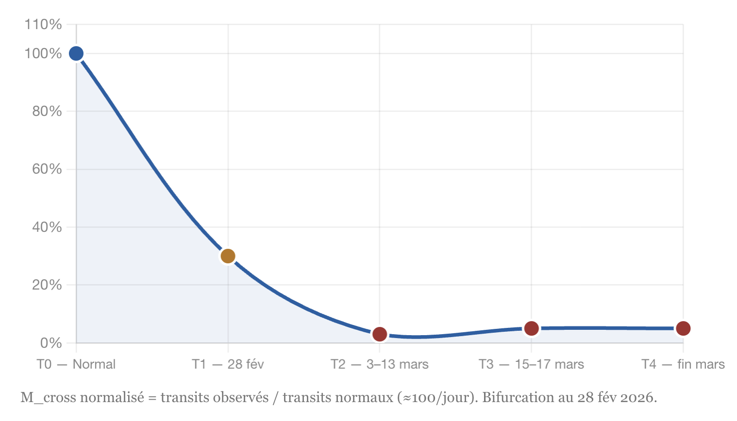 M_cross normalisé = transits observés / transits normaux (≈100/jour). Bifurcation au 28 fév 2026.