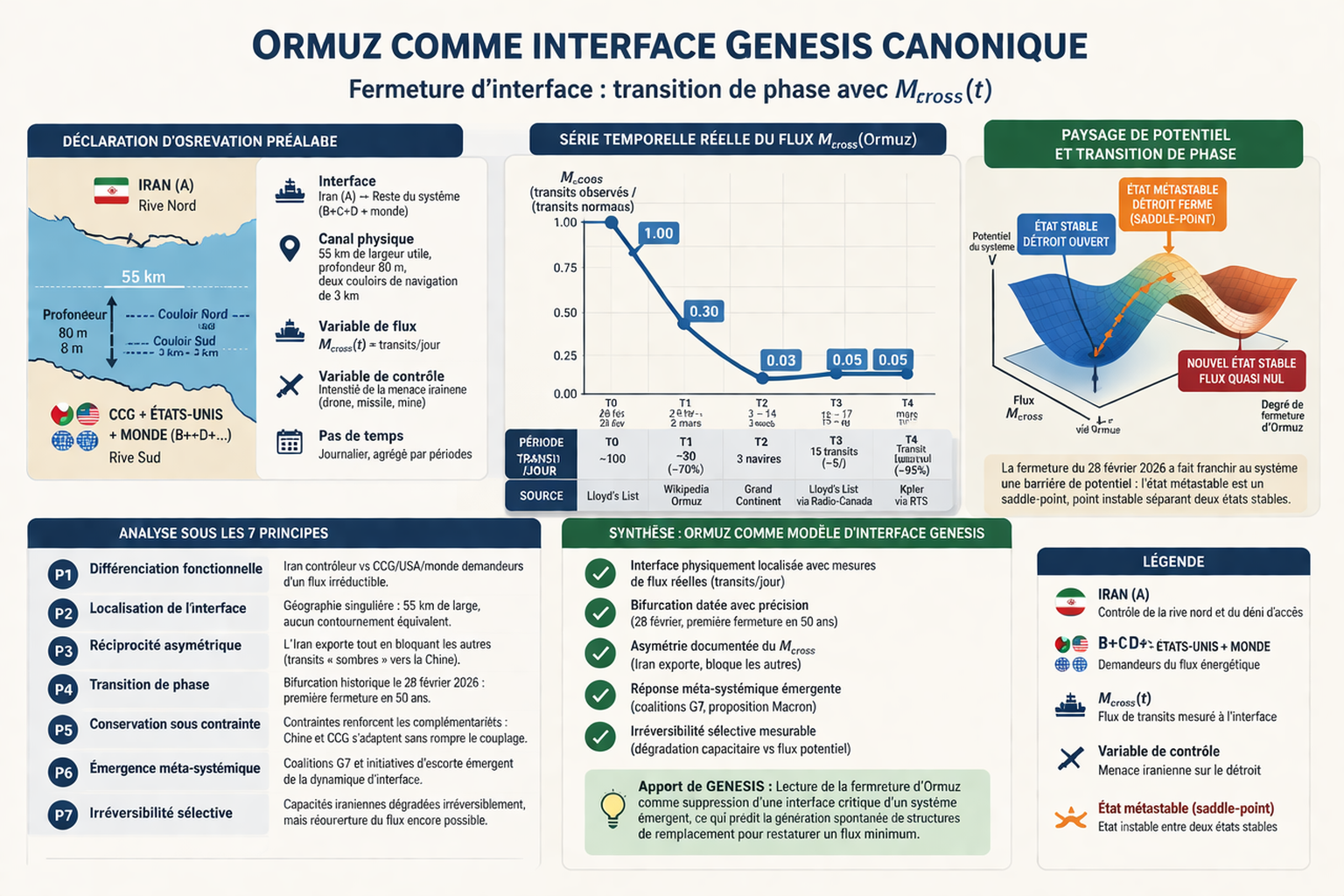 Ce que GENESIS apporte ici que l’analyse géopolitique standard ne donne pas : la lecture de la fermeture d’Ormuz non comme un acte de guerre mais comme la suppression d’une interface critique d’un système émergent — ce qui prédit que le système va spontanément générer des structures de remplacement (pipelines alternatifs, coalitions d’escorte, transits sombres) pour restaurer un flux minimum. C’est exactement ce qu’on observe.