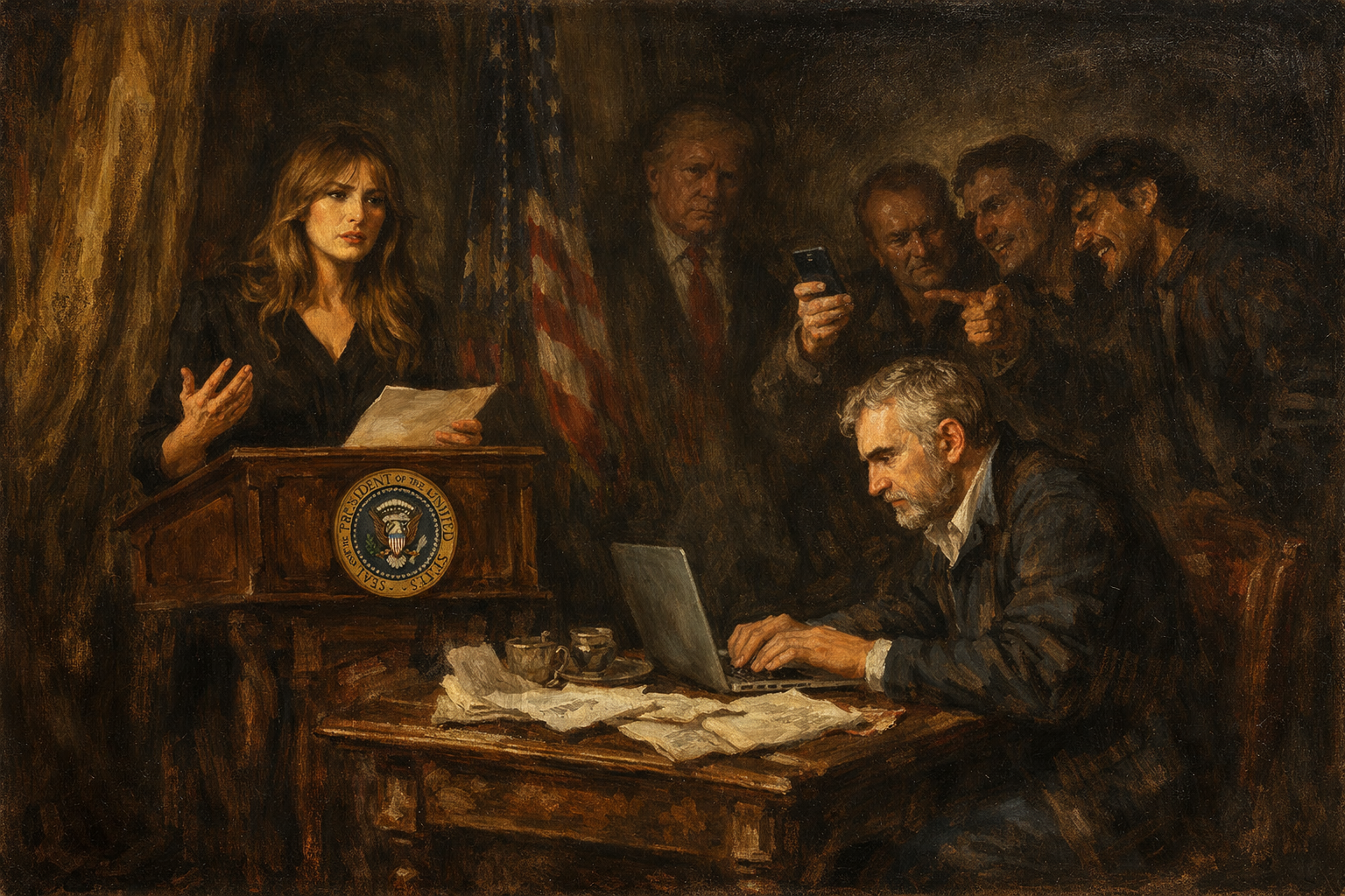Ce schéma produit naturellement une impression d’orchestration, même si celle-ci ne peut pas encore être démontrée. Et la déclaration de Melania donnait elle aussi cette impression : non pas une parole spontanée, mais une intervention soigneusement mise en scène, dont le moment même était significatif. Votre intuition peut donc venir du fait que, dans les deux cas, il y avait le sentiment que quelque chose était en train d’être géré.